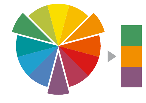 Selectarea a trei culori egal distantate pe roata de culori poate crea un sentiment de vivacitate. Aceasta functioneaza cel mai bine pentru culorile florilor si frunzelor, mai degraba decat pentru materialele de amenajare dura, unde combinatiile triadice pot fi exagerate si pot parea haotice. Conceptul principal implica lucrul cu armonia si contrastul pentru a dezvolta o experienta vizuala care sa atraga privitorul.